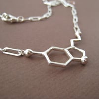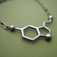 This is a rugged, weathered version of my serotonin necklace. The serotonin neurotransmitter makes us feel pleasantly happy, relaxed, and satiated. I've attached a pendant based on the shape of serotonin to a chunky link chain and oxidized the metal to take of the sheen and give it an aged, rustic look.