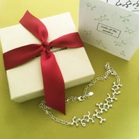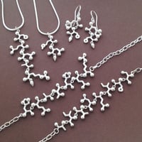 I've made sterling silver charms in the shapes of the amino acids. They link together via the peptide bond positions. Choose your favorite word or name, and I’ll make a custom necklace (soldered together N to C, of course).